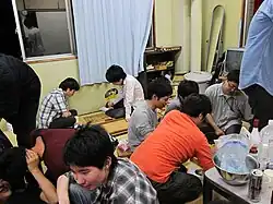 Konpa are heavily planned, and an appointed organizer (termed kanji in Japanese) often seeks out the location, determines a time, and sets the price for each attendee. The participants in the parties are pre-determined, and it is not typically accepted to attend or join in a konpa if one is not invited by the kanji. Attendees typically sit on the floor on a sitting cushion (see: zabuton) around a long table in a secluded area of the predetermined venue. In some cases attendees will be seated at one or several Western-style tables. As typical of Japanese drinking gatherings (see: nomikai), konpa often begin with an opening speech from a senior member or organizer and a toast.[4] Drinks are brought in by a wait staff along with various types of snacks thought to go along with alcohol (termed tsumami in Japanese). It is typical to have a time-restricted "all you can drink" period termed nomihōdai (or nomihō for short) that is paid for by a set fee. This often comes along with a certain number of snacks, and extra items can generally be ordered for an additional price. A beer-only "all you can drink" period is usually cheaper than an all-inclusive period including heavier liquors. This system is conducive to the heavy drinking prevalent among Japanese university students, which is viewed as a way of relaxing to permit more uninhibited conversation between attendees. It is common for attendees to drink to the point of vomiting or losing consciousness.[5] It is usually the duty of the organizer to ensure that everyone has all of his or her own belongings and that they return home safely.