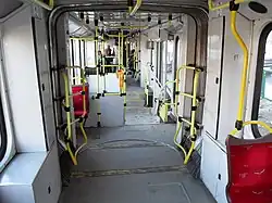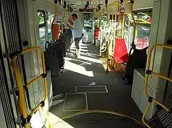 The floor is made of plywood-rubber panels and covered with anti-slip flooring. The flooring is smooth and folded onto the walls to facilitate interior cleaning.[1] The tram is equipped with five doors, each 1,300 mm wide, folding outwards, secured with a triple system to prevent passengers from being caught (sensitive edges, phototube, overload switch). The doors can be opened centrally by the driver and by passengers using buttons.[1]