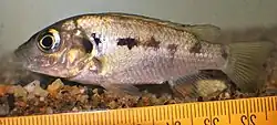 The konye is a small species of cichlid growing to a length of about 9.3 cm (3.7 in). It is somewhat laterally compressed and has a horizontal mouth and sloping forehead. The fins are colourless. the dorsal fin has 15 to 16 spines and 10 to 11 soft rays; the anal fin has 3 spines and 8 to 9 soft rays.[2] The colouring of this fish is distinctive, with a pale background shade and a row of dark blotches running down the back, and another row along each flank. The head is mostly bare of scales, the cheeks have a few scales and the body is fully scaled.[3]