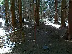 There is no marked tourist trail leading to the summit. A main ridge path (marked with two horizontal white stripes on tree trunks) runs across the summit area from the tourist junction (Czech: Skály pod Kopřivnou).[2][6][7] The summit is located within dense spruce forest and, therefore, is not a viewpoint.[4][6] About 15 m (49 ft) north of the summit, there is a rock formation[8] with approximate horizontal dimensions of 50 m × 30 m (164 ft × 98 ft), covering an area of about 1,110 m2 (11,900 sq ft), surrounded by a spruce forest. The summit area contains a triangulation station, marked on geodetic maps with the number 12, at an elevation of 1,019.18 m (3,343.8 ft) above sea level and geographical coordinates 50°02′15.31″N 17°16′50.34″E / 50.0375861°N 17.2806500°E / 50.0375861; 17.2806500. Next to this point, there is a steel post with a metal plate at the top bearing the inscription Státní triangulace Poškození se trestá.[b] The station is located near the main ridge path, about 11 m (36 ft) south of the summit. The State Administration of Land Surveying and Cadastre lists the highest point of the mountain – the summit – at 1,019.4 m (3,344 ft) above sea level and coordinates 50°02′15.7″N 17°16′50.2″E / 50.037694°N 17.280611°E / 50.037694; 17.280611.[4]