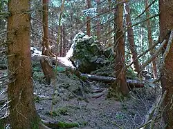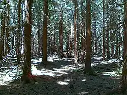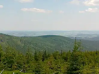 All types of forestation are present here: spruce forest, mixed forest,[a]The forest stand of the entire Jeseníky Protected Landscape Area includes: European spruce 84%, European beech 10%, European larch 1.5%, sycamore maple 1.1%, birch 1%, common alder 0.8%, dwarf mountain pine 0.4%, grey alder 0.3%, (European silver fir, European ash, and linden) 0.2%, Scotch pine 0.1%, and others (Pinus mugo, oak, hornbeam, Norway maple, elm, rowan, green alder, aspen, poplar, and goat willow) 0.2%.[5] and deciduous forest, with dense spruce forest slightly predominating.[4][6] Significant areas covered by spruce and mixed forest are found on all slopes, and as the elevation decreases on the northeastern, eastern, southeastern, and southwestern slopes, areas of deciduous forest appear, with meadows at the base of the eastern and southeastern slopes. Almost all slopes feature glades, and the eastern slope has significant clear-cuts for ski runs and related ski lifts.[6] At the base of the eastern and southeastern slopes, near road No. 445, there is an overhead power line of 22 kV supplying electricity to the buildings of Malá Morávka. All slopes have occasional larger rock outcrops and rock groups (e.g., Skály pod Kopřivnou). Additionally, the northeastern and southeastern slopes have significant boulder fields.[2]
