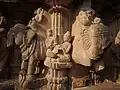 Entering the Svarga Mandap, there is a circular opening seen at the top. It is supported by 48 hand-carved pillars. At the periphery of the Svarga Mandap there are carved idols of Lord Ganesh, Karthikeya swami, Lord Kubera, Lord Yamraj, Lord Indra, etc. along with their carrier animals like peacock, mouse, elephant, etc. Standing at the center of the Svarga Mandap, one can see idols of Lord Brahma on the left hand side wall of the entrance of Sabha Mandap. In the center, people can see the Shiva Kopeshwar shivling situated in the Garbh Gruha & towards the right hand side wall the carved idol of Vishnu is visible. A stone pedestal mounted east of the temple's southern door has a carved inscription in Sanskrit, written in Devnagari script . It mentions that the temple was renovated in 1136 by Raj Singhadev of yadav dynasty.