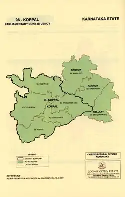 Koppal Lok Sabha constituency is one of the 28 Lok Sabha (parliamentary) constituencies in Karnataka state in southern India.[1] This constituency covers the entire Koppal district and parts of Raichur and Bellary districts.