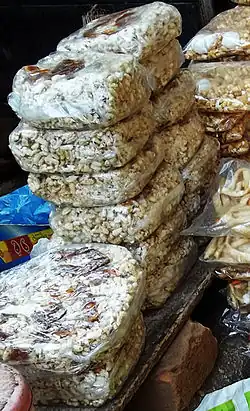 Korakhai is a sweetmeat whose principal ingredients are khai (a form of puffed rice), jaggery, coconut and cardamom.[1] It is a traditional Odia food, mainly served as a prasad in temples. It is a common food in the state of Odisha, India. Pilgrims offers Korakhai as a form of prasad to lord Lingaraj.[2] It is also a form of caramelized lia, and is also known as Leeaa in western Odisha.