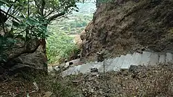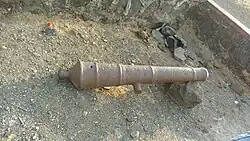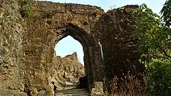 A temple to its patron goddess Koraidevi[6] also exists along with several smaller temples dedicated to Vishnu and Shiva. The former has been recently renovated and has a 3-foot-high Deepmala(tower of lamps).[4] The interesting part of the fort is that its wall is completely intact and one can walk along its entire perimeter(about 2 km).[4] Its massive gate is also intact. Several ruins of older structures within the fort still exist. It has six cannons - the largest of which called the Laxmi Toph is located near the Korai Devi temple.[4][6][7]