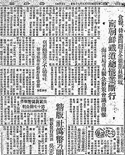 ![]() September 25, 1946 Dong-A Ilbo headlines: "All employees strike due to food and Daewoo issues. Emergency meeting is held at the maritime office South Korea's railway general strike operation. 'The strike is illegal' – Minister of Military Affairs" | |