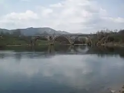 Kosinj Bridge (Croatian: Kosinjski most ) is a 70-metre (230 ft) stone bridge in Kosinj region in Lika, Croatia. It connects the villages Gornji Kosinj and Donji Kosinj. It was designed in the 20th century by Milivoj Frković, and was modelled on the old Croatian bridge-building technique of stone clipping. The bridge features piers designed to reduce or eliminate scour damage.[1] Not only does this design help relieve the impact of waves on the bride, but it creates symmetrical circles in the water.[2]