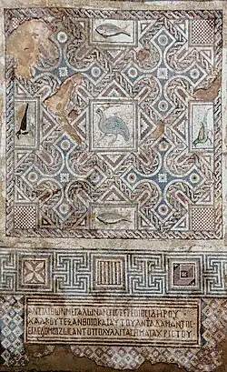 The House and Baths of Eustolios, situated on the crest of the southern cliffs immediately above the theatre, was constructed in the late-fourth century over the remains of a structure destroyed in the mid-4th century. In the early years of the fifth century, soon after the completion of the house, a bathing complex was constructed along the house's northern side. The household and bath annex on the northern side contains more than thirty rooms. The complex was entered from the west, the visitor passing into a rectangular forecourt. A salutatory inscription in the vestibule beyond the forecourt reads, "Enter for the good luck of the house." Rooms were arranged north and south of this forecourt and the vestibule, including a peristyle courtyard to the south at its eastern extent. The southern peristyle was arranged around a central pool and is the centrepiece of the household, its porticoes adorned with elaborate mosaics. A mosaic inscription in the eastern portico identifies the building as Eustolios, who built the structure to alleviate the suffering of the populace of Kourion, presumably in response to the earthquakes of the mid-to-late 4th century. The inscription identifies Eustolios as a Christian, concluding, "this house is girt by the much venerated signs of Christ." The accompanying iconography includes figural depictions of fish and birds (grey goose, guinea hen, falcon, partridge and pheasant).