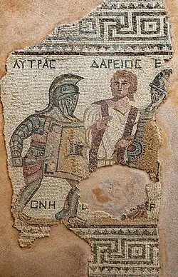 The main wing of the structure is arranged around a central peristyle courtyard. The northern and eastern portico of the atrium contains two panels depicting gladiators in combat, the only such mosaics in Cyprus.[42][43] The structure was extensively damaged in the earthquakes of the late-4th century, but the east rooms seem to have been used until the mid-7th century.