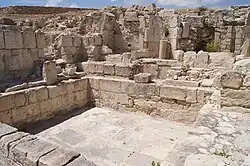 During the Diocletianic Persecution, Philoneides, the Bishop of Kourion, was martyred. In 341 CE, the Bishop Zeno was instrumental in asserting the independence of the Cypriot church at the Council of Ephesus. In the later-4th century (365-370), Kourion was hit by five strong earthquakes within a period of eighty years, as attested by the archaeological remains throughout the site, presumably suffering near-complete destruction.[13] In the late fourth and early fifth centuries, Kourion was reconstructed, though portions of the acropolis remained abandoned. The reconstruction included the ecclesiastical precinct on the western side of the acropolis. In 648-49, Arab raids resulted in the destruction of the acropolis, after which the centre of occupation was relocated to Episkopi, 2 km to the northeast. Episkopi was named for the seat of the bishop (Episcopus).[11][14][15]
