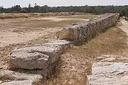 The stadium of Kourion, located 0.5 km west of the acropolis and 1.1 km east of the Sanctuary of Apollo Hylates, was constructed during the Antonine period (c. 138–180). The stadia at Kourion was 187 m long with a starting line marked by two circular stone posts, set wide enough to accommodate eight runners. The dromos was enclosed on the north, west and south by a free-standing curved seating structure measuring 217 m long and 17 m wide. This structure consisted of seven rows of seating supported by a 6 m thick ashlar wall. Seating was probably accessed by stairs set at 10 m intervals along the exterior. The dromos was accessed through gaps in the seating in the middle of its north, south and western sides. This structure provided sufficient seating for approximately 6,000 spectators. In its entirety the stadium measured 229 m long and 24 m wide.[50] The stadium was abandoned in later-half of the 4th century. It remains the only excavated stadium in Cyprus.