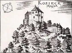Built after 1250, the castle itself was first mentioned only in 1332 (in Latin) as castrum Cozyak, although the historian Johann Weikhard von Valvasor notes that a knight Ulrik of Kosieck must have already been the owner of the castle in 1274. Initially, the area was part of the lordship of Šumberk; after the Counts of Gorizia had the castle built, it became the home of the knights of Kosieck and a separate lordship of Kozjak was established around it. After the death of Ulrik of Kosieck in 1317, Ortolf of Kosieck became the owner of the castle until 1329. The last native lord of Kozjak was - according to Valvasor - Louis of Kosieck, who was in 1475 captured by the Turks. Though his family ransomed him after a year for the sum of 2000 guilders, he died soon after his return, having allegedly been poisoned by his captors.