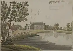 The three-winged building stands on a narrow, rectangular mound surrounded by a moat. The original stone house from 1490 was extended by statesman Mogens Gøye with three new wings, forming an enclosed courtyard. A tower was added on the west side. In 1631, Palle Rosenkrantz built an extra storey on the north wing and an octagonal tower on the southeast corner.[5] The south wing was destroyed by fire in 1689 and never rebuilt. The entire complex was renovated in 1780.