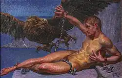 Late in life, Zahrtmann produced a number of paintings of nude men, including Prometheus (1906), Sokrates og Alkibiades (1907, 1911), and Adam i Paradis (in two versions, 1913–14). In an era that was still shaken by the Great Scandinavian Sexual Morality Debate of the outgoing 19th century, these works were immediately scored as scandalous violations of public decency. The treatment of Adam is particularly provocative, with its vital, young, muscular Adam casually concealing his manhood with a sprig of fig leaves while leaning back in a lush, vividly colored botanic paradise, the snake arched halfway up his leg and darting its tongue. Museums primly declined to purchase these homoerotic works, and most are still in private hands. Zahrtmann never married, and in Copenhagen he was rumored to enjoy crossdressing.[5]