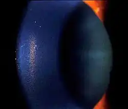 | Slit lamp photograph showing Krukenberg's Spindle as pigment cell deposits on the cornea | |