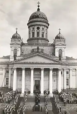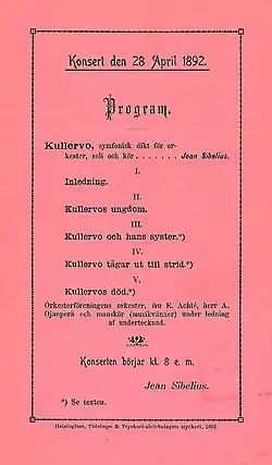 Kullervo premiered on 28 April 1892 at a sold-out concert audience in the Ceremonial Hall of the Imperial Alexander's University of Finland, Sibelius—initially pale and trembling—conducting. The soloists were the Finnish mezzo-soprano Emmy Achté and baritone Abraham Ojanperä.[8] The audience—a mix of the regular concert-going public and patriots there for the nationalist spectacle[8]—received two leaflets: first, a Swedish-language program that described Kullervo as a "symphonic poem" ("symfonisk dikt"); and second, text in Finnish, (with a Swedish translation) from The Kalevala for Movements III and V, as well as a motto that helped it to contextualize the instrumental Movement IV.[10] Notably, this was the first time in history that a concert audience had been given a Finnish-language text.[11] Although the orchestra overpowered Ojanperä and Achté,[8] the performance was a success: enthusiastic applause erupted after each movement and, at the end, Kajanus presented Sibelius with a blue-and-white-ribboned laurel wreath that quoted prophetically lines 615–616 of Runo L of The Kalevala: "That way now will run the future / On the new course, cleared and ready".[12] The next day, Kullervo received its second performance—again under Sibelius's baton—at a matinée concert, and on 30 April, Kajanus conducted the fourth movement at a popular concert that concluded the season.[13][9][c]