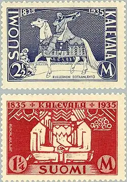 - ^ The Kalevala is a collection of folk poetry compiled by Elias Lönnrot. In the original version from 1835 (the Old Kalevala), all of Kullervo's story but his childhood enslavement (then in Runo XIX) is absent. Only with the epic's expansion in 1849, did Lönnrot—who between editions had visited the Karelian isthmus and Ingria and heard many oral poems about Kullervo—enlarge the Kullervo narrative and place it into its own cycle (Runos XXXI–VI).[4][5]