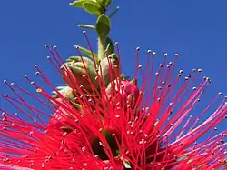 The flowers are arranged in loose groups of 6 to 14, each flower on a stalk 2.5–4.5 mm (0.1–0.2 in) long on the ends of branches which often continue to grow during the flowering period. There are leaf-like, egg-shaped bracts 4.5–6 mm (0.18–0.24 in) long and smaller bracteoles at the base of the flower and which fall off as the flower develops. The hypanthium is 4–5 mm (0.16–0.20 in) long and densely hairy on the outside. There are five hairy, pointed, triangular sepals 2–3.5 mm (0.08–0.1 in) long, which remain on the maturing fruit. The five petals are deep red, almost round and 3.5–5 mm (0.1–0.2 in) long. There are more than 70 bright red stamens 10–17 mm (0.4–0.7 in) long around each flower, the stamens three or four times as long as the petals. Some forms of the plant have white to pale cream-coloured flowers. Flowering occurs from June to November and is followed by fruit which is a broad, urn-shaped capsule, 4–5 mm (0.16–0.20 in) long with the erect sepals attached. The features of this species that distinguish it from others in the Myrtaceae are the red flowers, persistent sepals and deciduous fruit. The egg-shaped leaves and triangular sepals distinguish it from Kunzea baxteri which also has red flowers.[2][3][4][5]