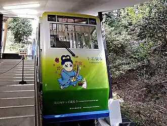 As a legally recognized Japanese railway line, this is the only one operated by a Japanese religious institution. This is also the shortest line in the country, with a length of 207 meters. The line was initially free to ride, with usage limited to believers of the temple's religion. The temple began requesting donations as a form of fare for the funicular when the line was made available to the public.[3] The line has only single car, counterbalanced by a weight.[1]