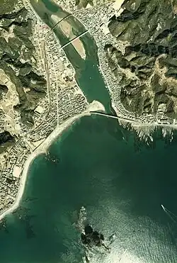 Aerial photograph of Kozagawa river estuary, showing Kuroshima