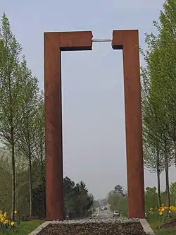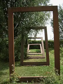 Against the backdrop of his qualifications in the field of landscape, it does not surprise that land-art objects and installation represent an important part of the current works by Kurt Fleckenstein. His objects deal with the surrounding landscape or town-scape. Strong encounters of the monumental, rust coloured objects which are a contrast to the green landscape come into being and connect with nature. Playing with gravity is particularly distinct in his work - when balls threaten to roll down a hill or cubes are ready to tip - but do not fall down. In his art he refers to minimalist positions and thus finds new ways to deal with reduction, so that an artwork is a thing by its own existence. “ That is what it is, no more and no less - it does not symbolise anything, it is just present in the context of its surroundings”. An example is the town entrance gate of Wroclaw.[4] A square measuring 8 by 8 meters defines the edge of town. At the same time the viewer establishes sight contact with the approaching town. The location and the context of the surroundings constitute the quality of the object. Other objects (photomontages) are located in almost untouched landscapes. In this examples the stress ratio between the geometry and pure nature in its spatial interaction is thematised.