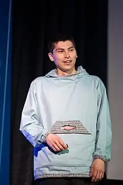 Though kuspuks are traditionally a Yup'ik garment,[8] they are now worn by both men and women of many Native groups, as well as by non-Natives.[5][8][9] The garment was originally made of animal skin or gut and was worn over a fur parka to keep the parka clean.[5][10][6] As stores became more common in Bush villages, kuspuks began to be made of calico grain sacks.[5] Kuspuks are now generally made from brightly printed cotton calico, velvet, or corduroy trimmed with rickrack.[2][10][11] Today, kuspuks are often worn as a blouse with pants.[10][12]