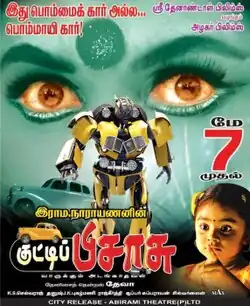 Kutti Pisasu in Tamil, Bombat Car in Kannada and Cara Majaka in Telugu is a 2010 Indian multilingual fantasy film written and directed by Rama Narayanan,[1] who returns after an eight year sabbatical.[2] The film stars Baby Geethika, Ramji, Rajiv Kanakala, Silli Lalli Ravishankar, Sangeetha, and Ramya Krishnan, while Riyaz Khan, Shafi, Ganja Karuppu, and Nassar play supporting roles.[3] Each version has a slightly different supporting cast.[4] The Tamil version was dubbed in Hindi as Magic Robot and in Bengali as Robot - The Magic Car. The Tamil version was named after a song from Kaalai (2008), which also stars Sangeetha.