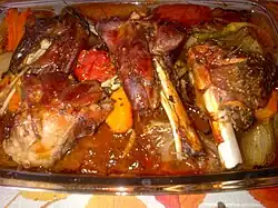 Lamb tandoori or tandoori kebab (Turkish: Kuzu tandır or tandır kebabı), is a meat dish in Turkish cuisine. It belongs to the Akşehir region.[1][2][3] It is prepared with lamb, onion, tomato, potato and peppers. Lamb pieces (sometimes a whole lamb) baked in an oven called a tandır, which requires a special way of cooking for hours. Served with bread and raw onions.