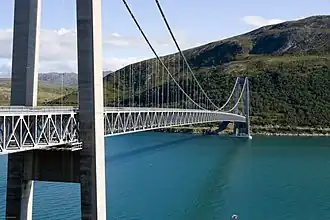 The Kvalsund Bridge (Norwegian: Kvalsundbrua) is a suspension bridge in Hammerfest Municipality, Finnmark county, Norway. The bridge connects the mainland and the island of Kvaløya across the Kvalsundet strait. The bridge is located just west of the village of Kvalsund on the mainland and about 25 kilometres (16 mi) south of the town of Hammerfest.[1]