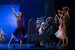 Theatre reviews describe Radu Poklitaru as a wizard of choreography, who inspires a new life in old fairy tales on the ballet stage – The Nutcracker, The Little Prince, Swan Lake....[23] Every new production of the company is based on the original interpretation of some apparently familiar story through the prism of Poklitaru's vision. Thus, only the characters' names are retained from the classical plot of Prosper Mérimée's short novel Carmen – a village girl Michaela becomes the central figure: this dreamy blond is captivated by the world of television serials (hence the title of the production Carmen. TV);[24] his Giselle is not a sweet country girl, but an unfortunate child of a big modern city;[25] the first episode of Swan Lake begins with the murderous shooting of a swan family and the subsequent care of the rescued cygnet by the infernal Lord Rotbar;[26] the story of the Nutcracker is not focused on a liitle daughhter of wealthy parents – it centers round a teenager, a backfisch who has to go begging in the cold, snow-covered streets of a big city and then has a wonderful dream, falling asleep in the open.[27]