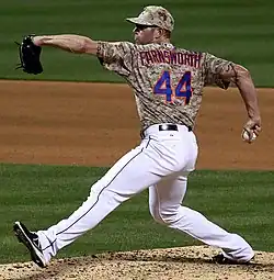 On April 20, Farnsworth was named the new Mets closer after another blown save by Parnell's replacement, José Valverde.[26] Farnsworth earned his first save as closer the next day in a 2–0 shutout of the St. Louis Cardinals.[27] Farnsworth earned his second save as Mets closer three days later on April 23, giving up a run on three hits but managing to hang on for a 3–2 win over the Cardinals.[28] The next day on April 24, Farnsworth was passed up for a save opportunity in favor of Daisuke Matsuzaka. However, after the game, Mets manager Terry Collins stated that Farnsworth was still the closer and that the Matsuzaka was the backup option.[29] On April 26, Farnsworth gave up a 10th inning home run to Miami Marlins catcher Jarrod Saltalamacchia, allowing Miami to go on to win 7–6, and earning Farnsworth the loss.[30] On May 3 in a game against the Colorado Rockies, Farnsworth gave up a walk off two-run home run to pinch hitter Charlie Culberson, earning Farnsworth a blown save and his second loss of the season.[31] On May 10, Farnsworth earned his third loss of the season, giving up a go-ahead single to Ryan Howard, which resulted to a 5–4 loss to the Philadelphia Phillies.[32] Farnsworth rebounded on May 12, getting his third save of the season in the opening game of the Subway Series against cross town rivals the New York Yankees.[33] This was Farnsworth's last appearance as a member of the Mets.
