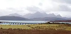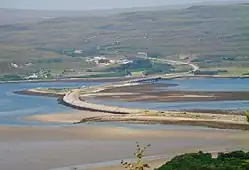 The bridge and causeway were built by Sir Alexander Gibb & Partners in 1971 to carry the A838, the road from Thurso to Durness, across the loch.[1][2] Until 1956 there had been a passenger ferry but the route around the head of the loch involved a narrow road some 10 miles (16 km) long.[3] The causeway is 3.8 kilometres (2.4 mi) long and it crosses a natural island, Tongue Island (Scottish Gaelic: Eilean Thunga).[4][5] The 183-metre-long (600 ft) bridge is at the western end of the causeway and it has eighteen spans supported by twin piers.[4][6] The bridge was fully refurbished in 2011.[6][7]