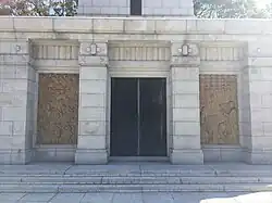 The front entrance is flanked by two relief. The relief on the left depicts the teachers protecting the students while during the typhoon disaster. The relief on the right depicts the Japanese emperor declaring something in a ceremony. [4]