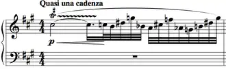The second subject appears in pure A major, the "ultimate tonal goal of the piece". The opening codas "louder and more animatedly until the very end". It ends with a loud tremolo, a group of grace notes ascending to two octaves of A notes in the highest registers of the piano, and a quick, final arpeggio, the same arpeggio used to accompany the first use of the second subject, played downwards, hitting the lowest note on the keyboard (A0) markedly.