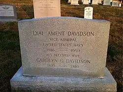 After October 1944, he served in the office of the Chief of Naval Operations and then the State-War-Navy Coordinating Committee. He retired as a Vice Admiral in June 1946 and lived in Washington DC. Davidson died after a lengthy illness at Bethesda Naval Hospital on 29 December 1950. He was survived by his wife and three children.[1] He was buried at Arlington National Cemetery on 4 January 1951, section 2, grave 4695-A. His wife Carolyn was buried there as well, after her death in 1980.[7]