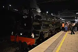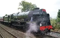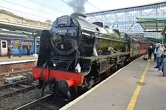 46115 took the Olympic torch train Thirsk where the Olympic torch party left the train to resume the torch's journey to Carlisle. Following this the train continued onto the National Railway Museum Shildon before being hauled by a diesel back down to Eaglescliffe and then 46115 took the train back to York.[6] 46115 was one of five steam engines to be chosen to haul the Olympic torch on its journey around the UK. The others were 7812 Erlestoke Manor (SVR), LMS Stanier Class 8F No. 48624 (GCR), BR Standard Class 4 4-6-0 No. 75029 The Green Knight (Whitby - Grosmont, NYMR) and 60007 Sir Nigel Gresley (Grosmont - Pickering, NYMR).