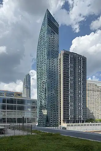 The L Tower (also known as the Libeskind Tower) is a residential skyscraper in Toronto, Ontario, Canada, which was designed by architect Daniel Libeskind. The project, which broke ground in mid-October 2009, saw many delays. One cause for delay was a stop-work order caused by safety concerns about the crane at the top of the building. The crane was also considered an eyesore by many residents.[7][8][9] Despite the cranes (which were removed by May 2016 and September 2018 respectively), the building still won the eighth place Emporis Skyscraper Award in 2017.[10][11]