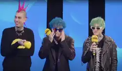 The band participated in the Sanremo Music Festival 2024 with the dance-pop song "Autodistruttivo", finishing in 27th place.[11][12][13][14] On the fourth night of the festival they duetted with Donatella Rettore to perform her song "Lamette".[15] The trio ended their performance on the final night by raising their flag, which is a tricolour flag in green, pink and blue, to match the hair colours of the band. They announced that the flag represented "valori umani" (human values) and "la lotta contro ogni forma di discriminazione, violenza, odio, razzismo, abuso e sessismo" (the fight against every form of discrimination, violence, hate, racism, abuse and sexism)[16]