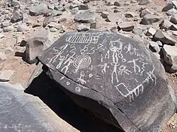 There are three types of petroglyph designs at La Silla: human and animal figures, abstract geometrical designs and purely ornamental ensembles.[43][44] Beside the petroglyphs there exists also a stone circle near La Silla, which is suggested as an astronomical tool. Three rocks aligned during the El Molle culture with Alpha Carinae, Beta Carinae and Alpha Centauri or Beta Centauri. This alignment occurred during late April and during May and could signal the beginning of the cold season. Farmers could have used this tool to determine when to move their herds, mostly camelidae, into their villages.[47] There are signs of illicit excavations at La Silla since the 1990s[43] and in 2017 some vandalism was discovered.[48]