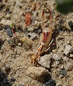 Labidura riparia is a species of earwig in the family Labiduridae characterized by their modified cerci as forceps, and light tan color.[2][3] They are commonly known as the shore earwig, tawny earwig, riparian earwig, or the striped earwig due to two dark longitudinal stripes down the length of the pronotum.[2][4] They are sometimes wrongly referred to as Labidura japonica, although said species is actually a subspecies, Labidura riparia japonica, found only in Japan.[5] L. riparia are a cosmopolitan species primarily in tropical to subtropical regions.[2] Body size varies greatly, ranging from 16 mm to 30 mm, with 10 abdominal segments.[2][3] Males and females differ in forcep size, with males having much larger and stronger curve, while females have smaller, straighter forceps with a slight curve at the end.[2] Earwigs use these forceps to assist in predation, defense, sexual selection, courtship and mating, and wing folding.[3][6]