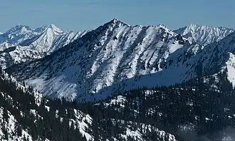 Labyrinth Mountain is a prominent 6,376 ft (1,940 m) mountain summit located 7.5 mi (12.1 km) north-northeast of Stevens Pass in Chelan County of Washington state.[3] This peak is situated 11 mi (18 km) west of Lake Wenatchee, in the Henry M. Jackson Wilderness, on land managed by the Okanogan–Wenatchee National Forest. Its nearest higher neighbor is Rock Mountain, 4.87 mi (7.84 km) to the southeast. Labyrinth Mountain was named by Albert Hale Sylvester for the appearance of its complex topographic map contour lines, similar to a Labyrinth. In association with Greek mythology, he also named Minotaur and Theseus Lakes on this mountain's southeast aspect.[4] Precipitation runoff from the peak drains into tributaries of the Little Wenatchee River.