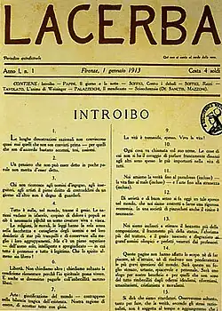 Lacerba was an Italian literary journal based in Florence closely associated with the Futurist movement.[1] It published many Futurist manifestos by Filippo Marinetti, Antonio Sant'Elia, and others.[2]