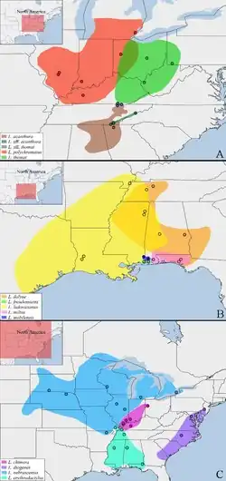 Lacunicambarus is one of the widest ranging crayfish genera in North America.[3] Species from this genus can be found in nearly every state east of the Rocky Mountains and in the Province of Ontario. Some species in the genus, such as L. nebrascensis, are remarkably widespread while others, including L. miltus, L. freudensteini, and L. mobilensis have very small ranges.