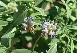 It is a perennial herb with a branching, heavily glandular stem growing 30 to 60 centimeters tall. The leaves are palmately compound, each made up of usually three linear or lance-shaped leaflets borne on a short petiole. The inflorescence is a raceme of flowers emerging from a leaf axil. Each flower is under a centimeter long with a pealike corolla in shades of light purple-blue to white. The fruit is a hairy, glandular, spherical legume.[4]
