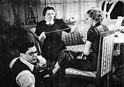 ![]() Shooting photo from Az én lányom nem olyan. On the left the director László/Ladislao Vajda, in the middle Ella Gombaszögi, on the right Klári Tolnay. | |