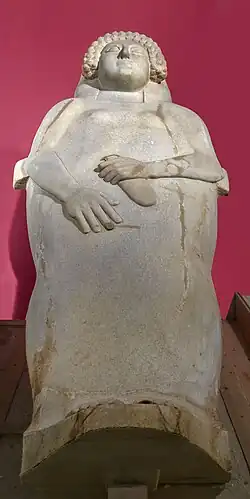 This figure conserves nuanced remains of the colours with which the carvers from the other end of the Mediterranean animated the whiteness of the marble used as the material to be sculpted. Much larger than life size, as is common in this kind of funerary carvings, the sculpture that has now come to be called the Phoenician Lady of Cádiz can be considered with absolute certainty as one of the oldest of its kind. Its realisation is placed around the year 470 BC, an early date in relation to the other similar works that some museums of the world conserve. The trousseau is quite discreet, since the Phoenician-Gaditan society did not show their social status through jewellery.[5]