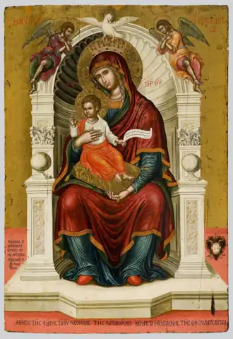 The materials used for the massive icon were egg tempera paint on wood. The painter also used gold leaf. The painting was completed in 1684. The height is 60.2 in (152.9 cm) and the width is 40.6 in (103.1 cm) exactly five feet tall. The Virgin is seated within a niche. Many painters used the niche in their works. The Madonna and Child by Filippo Lippi also features a similar shell-like niche behind the Virgin Mary. The Virgin is seated in a niche-like throne in Emmanuel's painting. The throne is elaborately decorated. Both Konstantinos and Emmanuel painted a similar throne. Konstantino's version lacks the shell like niche. In Emmanuel's version the Theotokos is crowned by a white dove while in Konstantino's version the Theotokos is crowned by two angels. Emmanuel's angels marvel at the Virgin and Child. The majestic throne features two symmetric decorative round orbs. Above the orbs follow two symmetric corinthian-like columns. The Virgin's heavenly crown is adorned with precious jewels.[4]