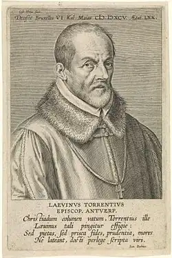 Laevinus Torrentius, born Lieven van der Beke (1525–1595), was the second bishop of Antwerp and one of the leading humanists of his time. He was a Neo-Latin poet, who achieved fame as the editor of Suetonius and Horace. spending many years in Rome in his youth, he developed a serious interest in ancient numismatics. He possessed a large library of about 1,700 books.[1]