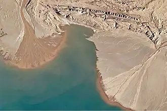 Ayakkum Lake (Chinese: 阿雅克库木湖; Uyghur: ئاياققۇم كۆلى) is a lake near the northern boundary of the Tibetan Plateau, to the southeast of the Kunlun Mountains.[1] While many of the small glacier and snowmelt-fed streams on the Plateau give rise to major South-east Asian rivers (including the Mekong and Yangtze), some empty into saline lakes such as Lake Ayakkum.[1] The lake is growing because of increased flows from small glacier- and snowmelt-fed streams.[2]