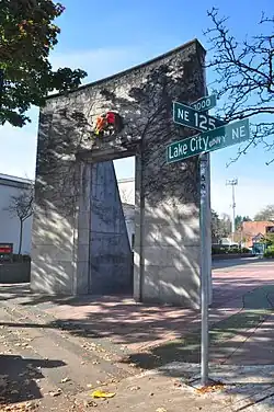 Lake City Mini Park at the southwest corner of Lake City Way NE and 125th Street NE preserves the entrance of a branch of a former Seafirst Bank.